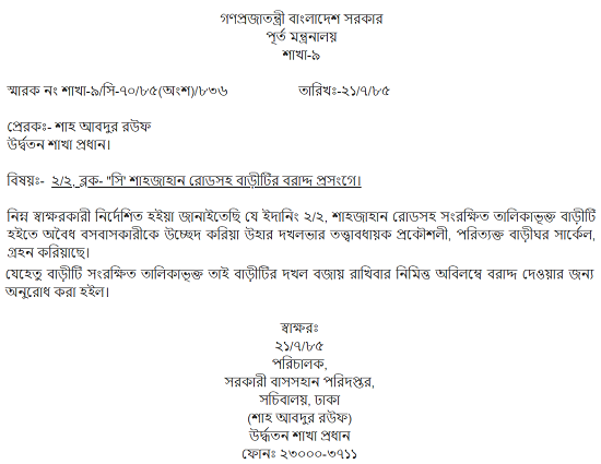 9. Upon conclusion of hearing, the matter was fixed for delivery of judgment on 08.02.2007. However, having gone through the materials before us, we found it necessary to call for the official file relating to the house in question from the Ministry and accordingly, the delivery of judgment was deferred until today. In the meantime, as per the Court’s order dated 15.02.07, the official file relating to the said house has been sent to the Court and we have perused the same. We have also permitted Mr. Ozair Farooq, the learned Advocate for the petitioner to peruse the file.